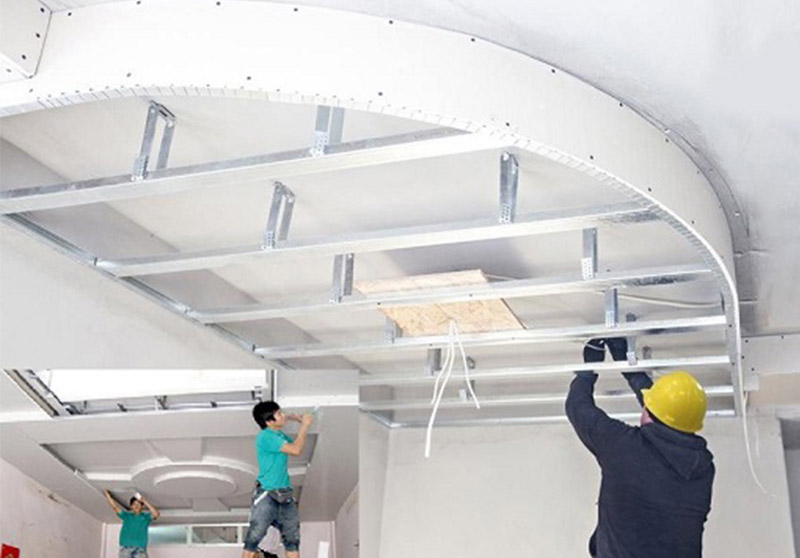 - Các thanh khung xương được đặt đúng theo bản vẽ chi tiết cùng với khoan bắt cố định tại vị trí. Các tấm thạch cao, thạch cao tạo hình được ốp vào vị trí khung xương hay trên bề mặt và cố định bằng ốc vít, băng keo.